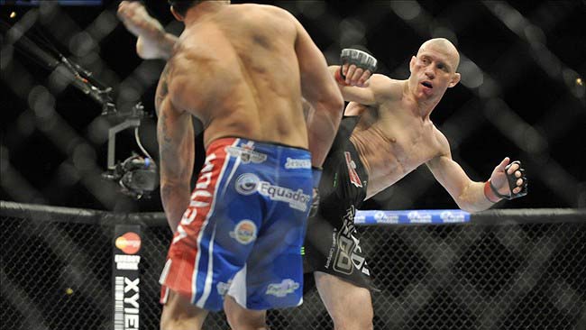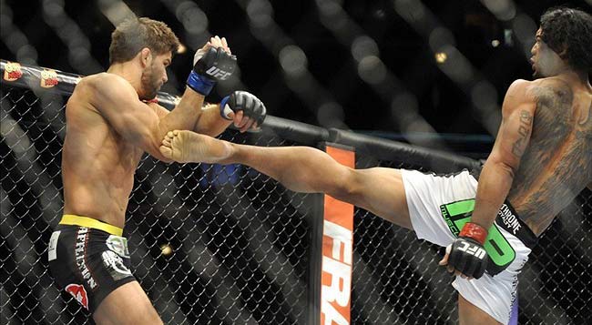 Дуэль с Мартинсом уложилась в первые пять минут и чем-то напомнила поединок Серроне-Гиллард, так как в обоих случаях американца спасли хорошо поставленные в кикбоксинге ноги. Разница заключалась в том, что Гиллард своими быстрыми руками несколько раз так приложился по «Ковбою», что тот прямо из клетки чуть не улетел на своё ранчо смотреть вестерны. Мартинс также много попадал руками, но его атаки оказались менее разрушительными, чем у Гилларда в августе 2012 года. Бразилец оказался более умелым боксёром и был точнее, а «Ковбой» обрабатывал Адриано киками. В какой-то момент стало ясно одно – выиграет тот, кто первый попадёт. Но кто это будет было непонятно, так как цели достигали взаимные подачи бойцов. За двадцать секунд до конца раунда американец всё-таки засадил точный правый хай-кик в стиле Никиты Крылова. Мартинс сразу же ушёл в глубокий КО. Нужно отдать должное опытному рефери Джону МакКарти, который своевременно оценил ситуацию и вмешался.