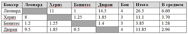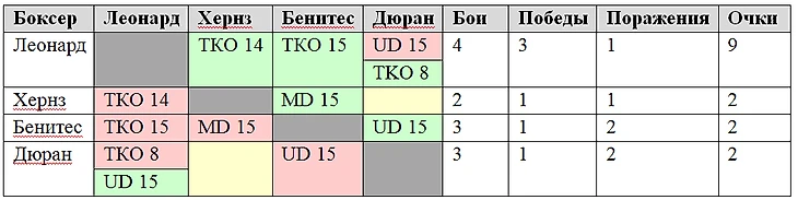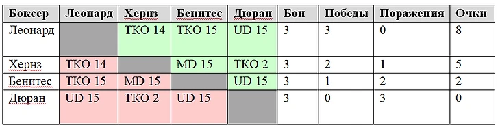 Применен следующий алгоритм подсчета очков: 3 – за победу нокаутом, 2- за победу иным образом, 1 – за ничью, 0 – за поражение. Преимущество Леонарда очевидно.