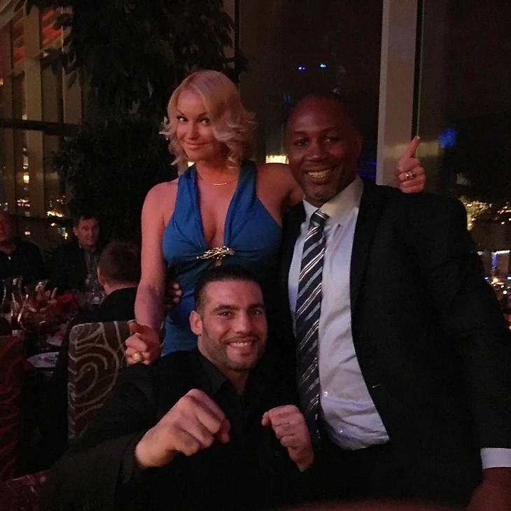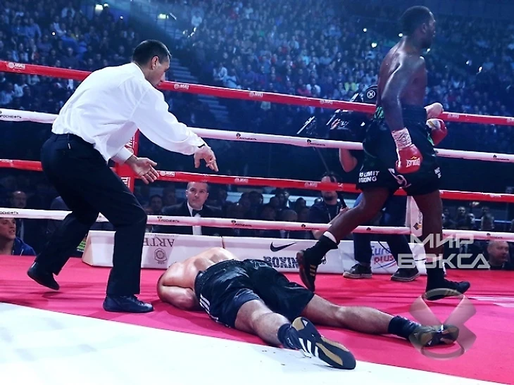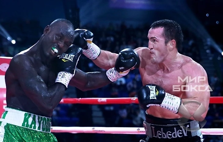 Летя на настил ринга, противник Лебедева, Латиф Кайоде, делает жест рукой, типа «нет нокдауна», но свирепый рефери Смугер открывает счет. Кайоде – бывший спарринг-партнер Лебедева. «Мы с ним договорились, что 5-го ноября мы снова друзья, но 4-го нет», – сказал Денис.
