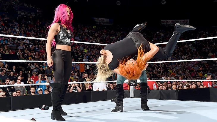 Одним из главных сегментов этого вечера стал разговор по душам между тремя участницами грядущего титульного матча на Wrestlemania. Первой к рингу вышла Шарлотта, которая потребовала подняться ни ринг обеим претенденткам. Первой вышла Бекки Линч, успев словив шутеечку от чемпионки. Далее на ринг поднялась Саша Бэнкс. Шарлотта зачитала промо, в котором поностальгировала по старым временам и раскаялась перед отцом за то, что не видела его правоту. Мол, ещё тогда Рик Флер ей говорил, что её подружки не стоят и выеденного яйца. Бекки моментально включилась в перепалку, заявив, что именно она уйдёт с титулом в начале апреля, на что последовало справедливое возмущение от Саши, заявившей, что ирландка профукала уже все свои шансы, и именно "босс" достойна носить титул. Когда дело приблизилось к рукопашной, обе претенеднтки переключились на счастливую Шарлотту и провели ей "суплекс" и "бэкстэббер", чтобы не расслаблялась. Также хочу отметить, что чемпионка в своём промо решила поиграть словами, обозвав подружек horsewoman (всадница). Это слово очень похоже на слово whorse-woman, и что оно обозначает Вам лучше загуглить самим.