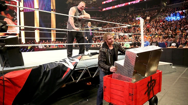 Предвосхищая поединок своего клиента на Wrestlemania, Пол Хейман в миллионный раз толкнул отличное промо, в котором прошёлся по достоинствам Брока Леснара. Дин Эмброуз даже не стал ввязываться в словесную полемику, а просто вышел к рингу с пустой тележкой, которую остановил аккурат перед комментаторским столом. Затем он достал из-под ринга кучу интересных и опасных предметов, утрамбовал их стальными ступеньками и в такой же тишине покинул помещение. Очень эффектный сегмент.
