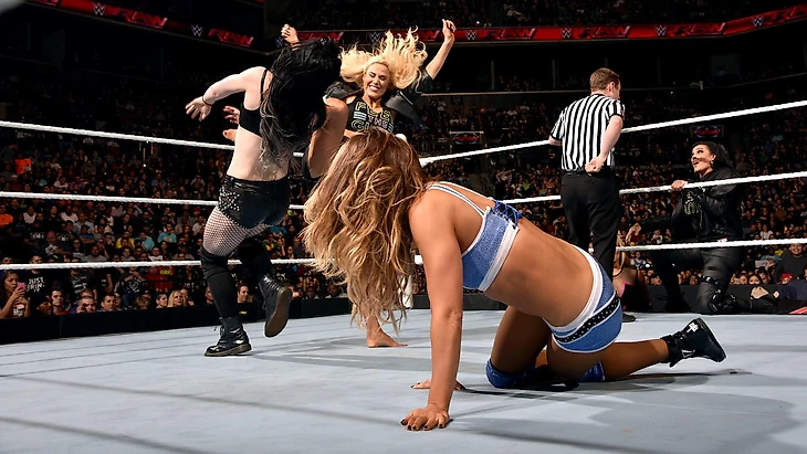 Пожалуй, одним из главных сюжетных разочарований в сезон Wrestlemania стала возня за титул Див. Вот и вчера все делали то, что нужно: Шарлотта доминировала, Саша Бэнкс комментировала, Рик Флер помогал дочке, а Бекки Линч вновь оказалась в дураках. Этому фьюду явно не достаёт личных мотивов и остаётся надеяться, что на самом PPV мы увидим достойный бой трёх девушек.