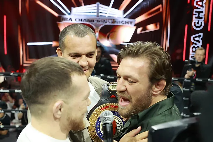 Конор и Ян устроили битву взглядов, Махачев пожал руку Поветкину. Вот это встреча в Дубае!