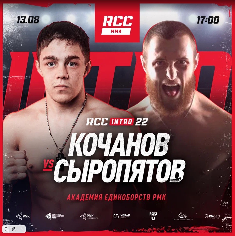 Алексей Кочанов (дебют) и Лев Сыропятов (1-2) встретятся на турнире RCC Intro 22 в Екатеринбурге. Бои пройдут 13 августа на арене Академии единоборств РМК.