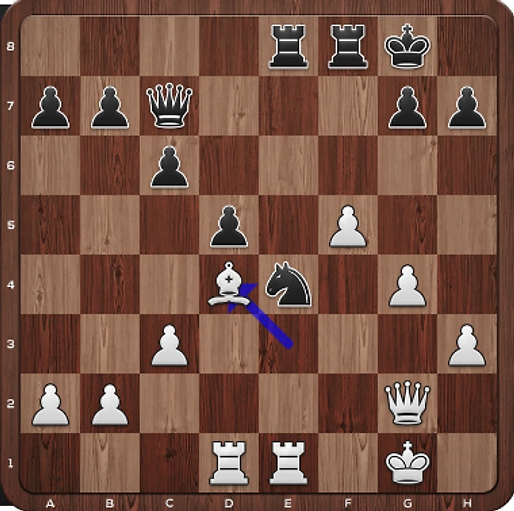 16.gxh3 Qxh3 17.Nf1 Rbe8 18.d4 f5 19.Bb3 c6 20.f4 Kh7 21.Bxd5?