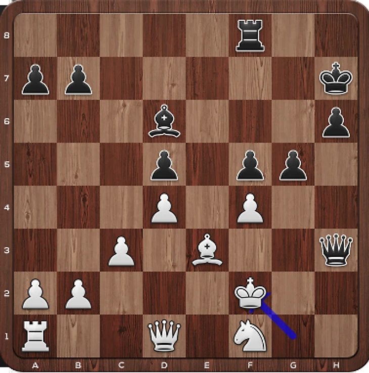 28.Qxf5+ Rg6 29.Ke1 h5 30.Kd1 Kh6 31.Nc2 h4 32.Ne1 h3