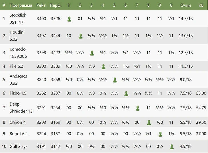 Хотя в турнире участвовали сразу 10 сильнейших программ, основное внимание приковывала "большая тройка" движков: Stockfish, Komodo и Houdini, которых считают самыми сильными программами всех времен.