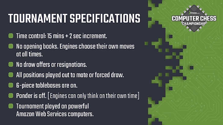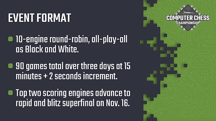 Чемпионат Chess.com среди компьютерных программ с участием 10 сильнейших движков мира был анонсирован в сентябре. Три игровых дня кругового турнира по быстрым шахматам позволили определить два сильнейших движка, столкнувшихся в борьбе за титул в увлекательном суперфинале.