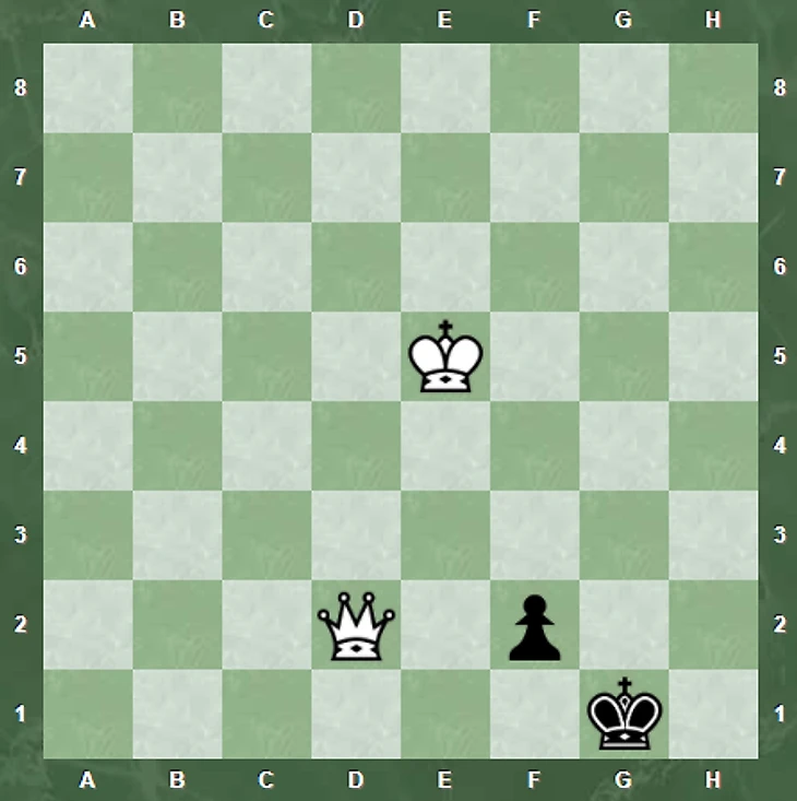 1.Kf4! Kh1 2.Qe2 Kg2 3.Kg4 Kg1 4.Kg3 f1 = N + 5.Kh3 Ne3 6.Qf3 Nf1 7.Qg2#