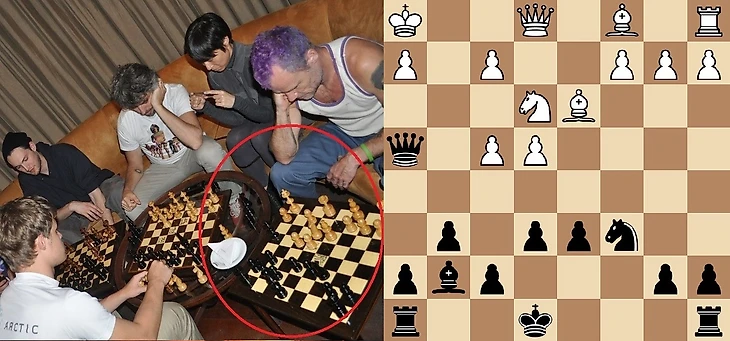 Так как Карлсен на фото занят партией рядом, а Фли вдумчиво сидит, то предположим здесь скорее всего ход белых. По оценке движка Stockfish15 уже -4.1 в пользу черных, что достаточно много. При таких оценках и при правильной игре черных без серьезных ошибок и явных зевков - у белых почти нет шансов удержаться даже хотя бы на ничью. Что касается самой позиции, то Фли на первый взгляд неплохо занял центр доски, но пешки, в частности F4 будет проблематично защищать. Особенно, если черные решат вскрыть линию F для своих двух ладей. Фли уже оказался без качества (слон против ладьи). У белых слабый Король на которого уже нацелился Ферзь черных, и при вскрытии линии F белых ждут серьезные проблемы совсем скоро. Также неразвит ферзевый фланг у белых и что делать дальше непонятно. Белые просто не успевают ввести в игру и задействовать свой единственный хоть какой-то козырь - двух слонов. Для чемпиона мира Магнуса довести эту партию до победы, конечно, не составило труда. Скорее всего в партии была сыграна Сицилианская защита и какой-то из вариантов Дракона, если обращать внимание на пешечную стуктуру и слона черных на G7. Фли не смог успешно выйти из этого дебюта и поплатился проигранным качеством и очень серьезными проблемами в миттельшпиле.