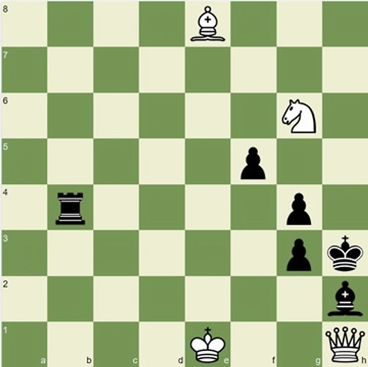 Теперь у черных лишняя ладья, но они оказываются в цугцванге - на единственный ход 5...g2 последует 6. Ke2x