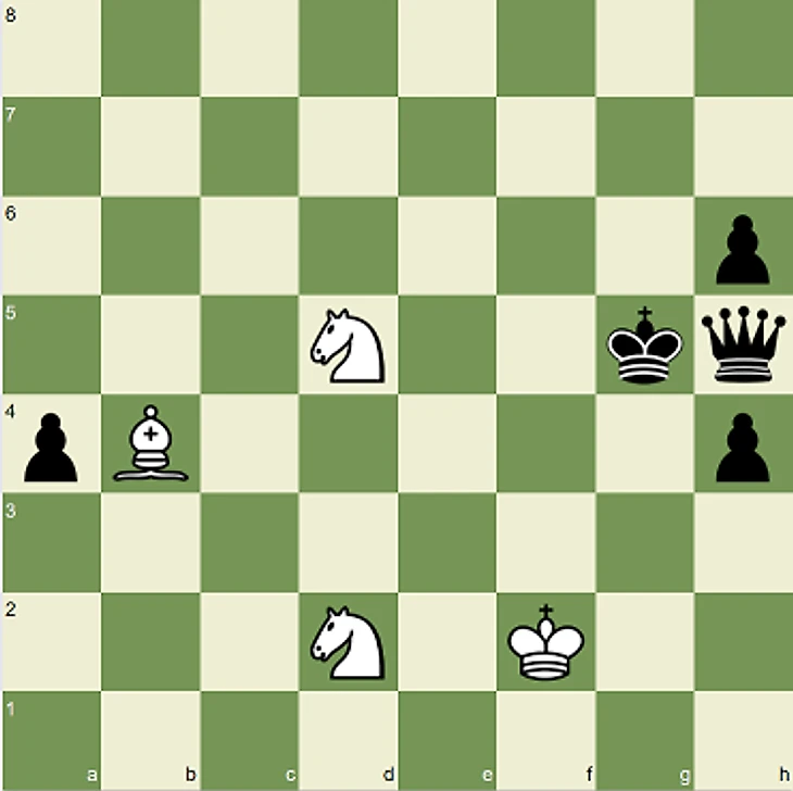 Чёрные готовы принести в жертву своего единственного коня за последнюю пешку белых, оставив их с двумя бесполезными конями. К победе приводит парадоксальный ход 5. f8K+! И белые превращают единственную пешку в третьего коня!