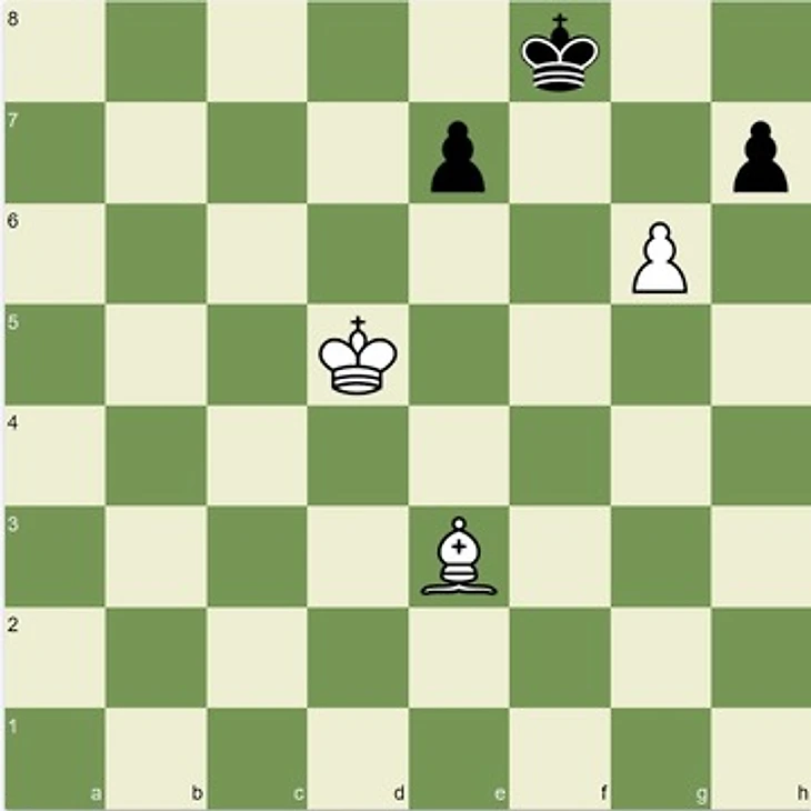 белые - Kpf2, Cb4, Kd2, d5; черные - Kpg5, Фh5, пешки a4, h4, h6. Выигрыш. 1. Ke4+ Kpf5! 2. Ca3 Kpe5. 3.Cb2+ Kpf5! 4. Kd6+ Kpg5 5. Cc1+ kpg6 (g4) 6. Kf4(f6)+, и белые выигрывают.