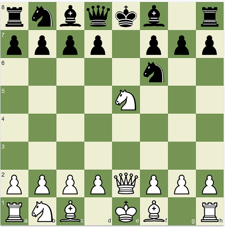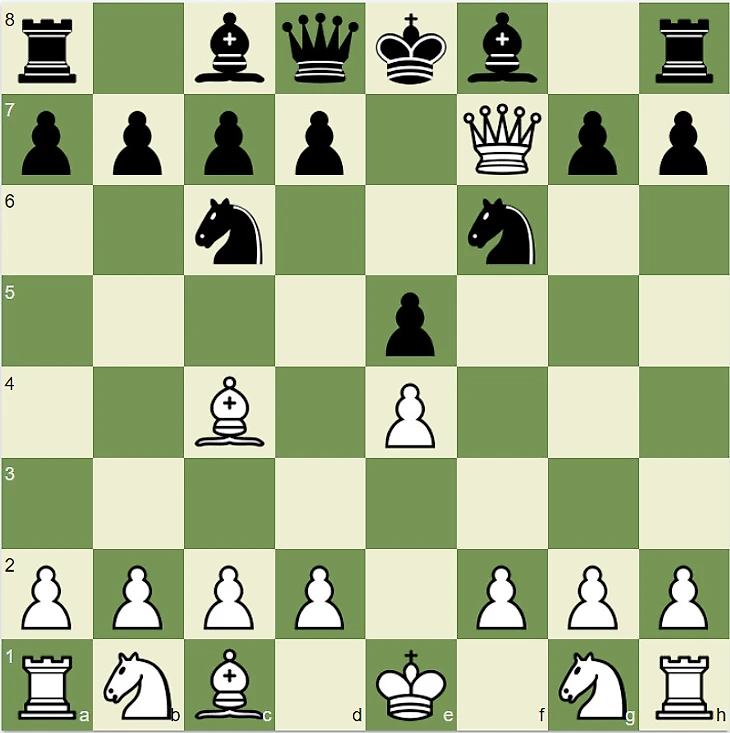 Рассмотрим еще один дебют. В нем уже произошел размен пешками, и король черных оказался под угрозой шаха. Ставит его ферзь при помощи коня.