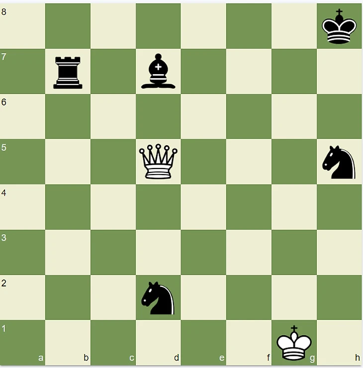 Ход белых. Достаточно ферзю сделать ход Фd3—h7, и партия будет окончена — мат королю, поскольку своего ферзя страхует слон на с2.