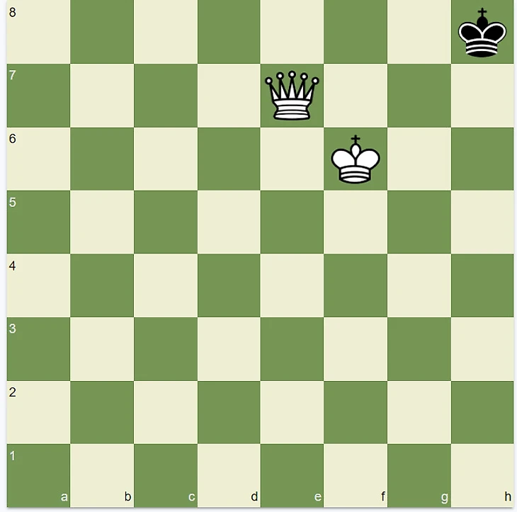 Ферзю требуется загнать короля черных в угол. Без своего короля мат поставить не получится, обязательно нужно, чтобы он оказался рядом. Порядок действий следующий. Белый ферзь становится от черного короля на расстоянии хода коня. В данном случае Фе7. Рядом обязательно должен находиться белый король. В таком случае ход Фе7—g7 приводит к мату, так как ферзь находится под защитой своего короля.