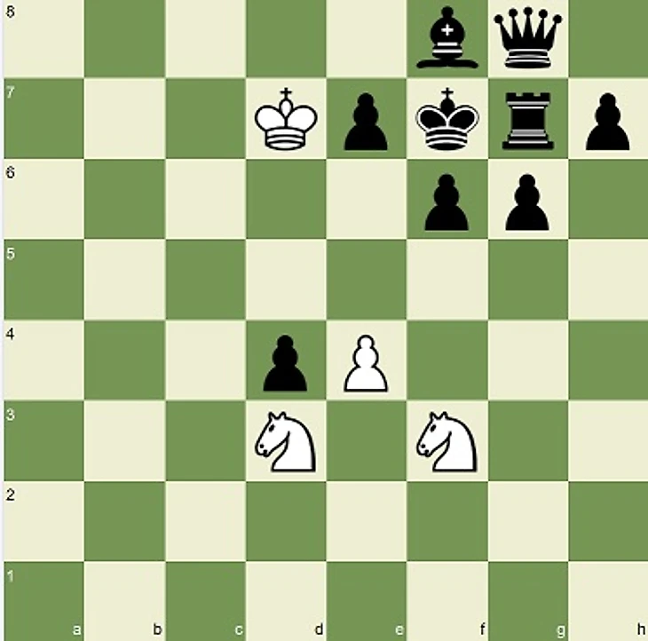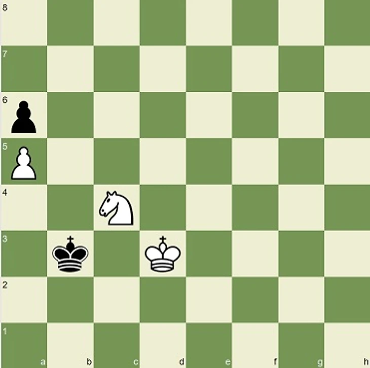 В этюде ниже, для достижения выигрыша нужно дать свободу действий белому королю. Вот почему, находящийся под его защитой белый конь, в свою очередь, защищающий пешку, стремится найти место подальше от черного короля.