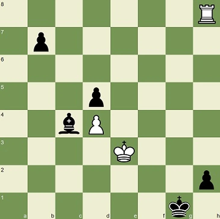 1. Лg8+ Kpf1 2. Лh8 Kpe1 Черные отдают пешку h2, иначе ходы будут повторяться 3. Л: h2 Kpd1 4. Лb2! b5 5. Kpf4! (ход, с целью совместить защиту своей пешки с нападением на неприятельскую) Kpc1 6. Лb4 Kpc2 7. Kpe5 (король успел вовремя) Kpc3 8. Л: b5 - ничья