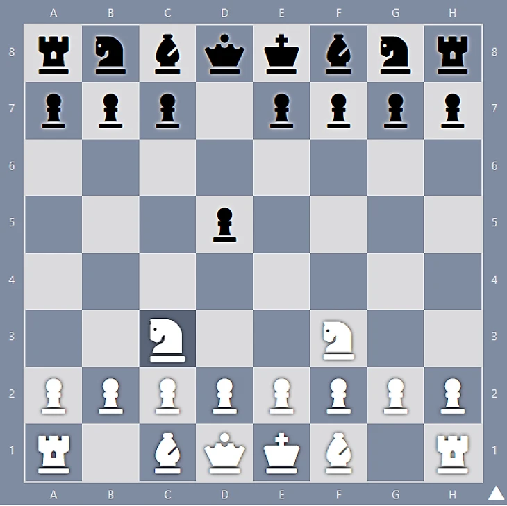 Вариант с ходом Nc3: 1. Кf3 d5 2. Кc3. Цель – контролировать центр, подготовить атаку на d5 и рокировку. Дальнейшие ходы: