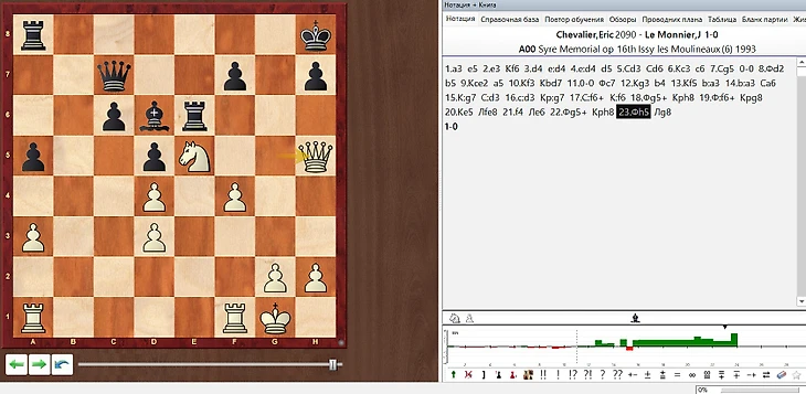 У игрока J. Le Monnier стоит рейтинг 0. Он проиграл игроку с рейтингом 2090 в 23 хода чёрными в дебюте Андерсена 1.а3.