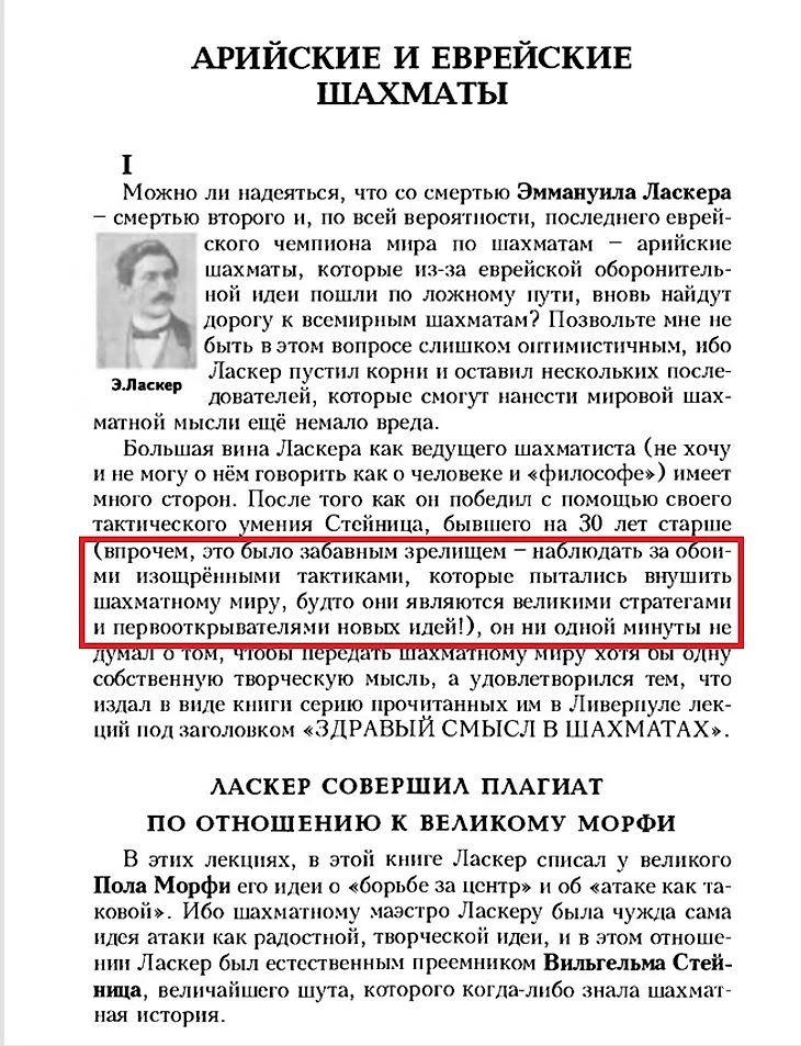 Однако на основании совпадения одной фразы делать глобальный вывод об антисемитизме Алехина и предлагать это в качестве «железного» аргумента - так себе идея. Тем более, что в этой части текста про Стейница и Ласкера вообще отсутствует слово «еврей». Не очень убедительно.