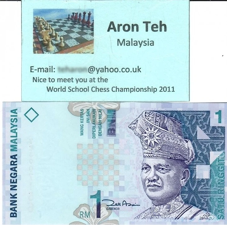 Надо сказать, что я каждому игроку перед началом партии дарил магнитик с видом Петербурга. Арон оказался первым соперником, от которого я получил ответный подарок, который можно было бы рассматривать как взятку: помимо визитки, он подарил банкноту в один малазийский ринггит.
