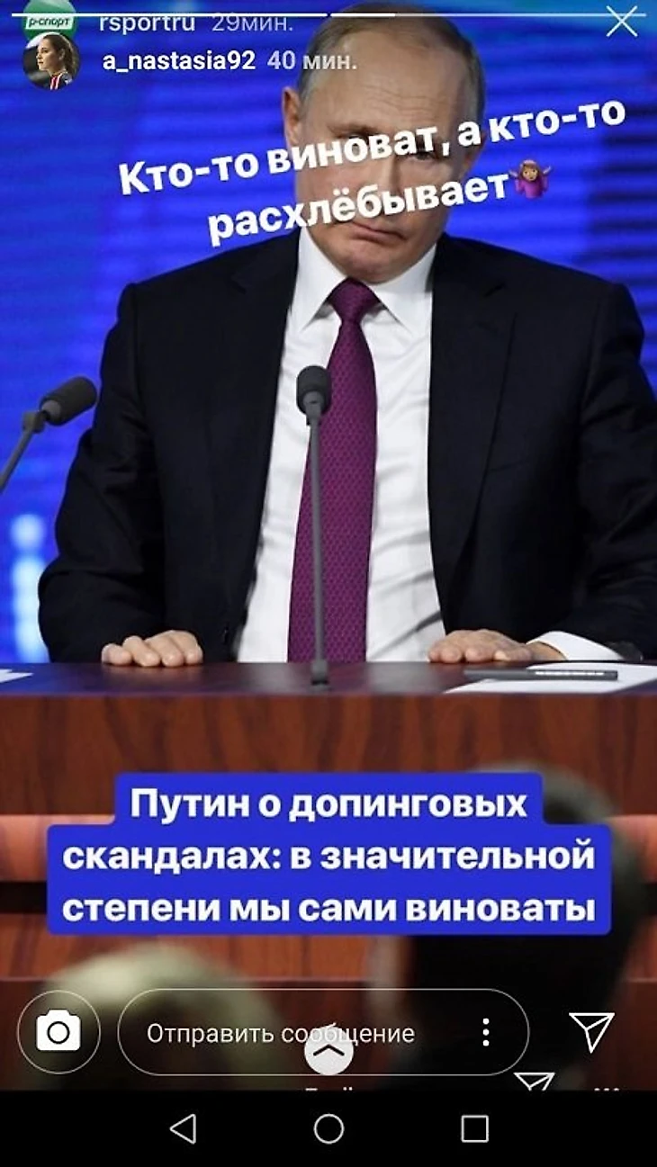Российская керлингистка Анастасия Брызгалова резко прокомментировала слова президента России Владимира Путина о допинге.