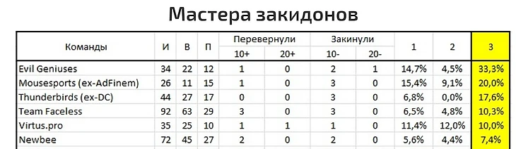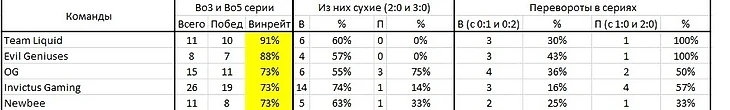 Как ни крути, карта — это одно, а серия матчей — совсем другое. Поэтому было бы глупо не обратить внимание на этот аспект. Я проанализировал точно так же и все серии матчей команд-участниц The Kiev Major с момента выхода патча 7.00. При этом, важно (!), не учитывал bo2 и bo1-матчи, а только bo3 и bo5. Здесь решил также применить систему баллов. За переворот в серии bo3 со счета 0:1 команда получает 1 балл, а за переворот в bo5 с 0:2 — 2 балла, что справедливо.