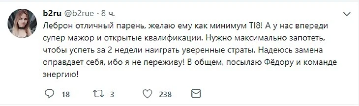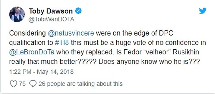 "Учитывая, что @natusvincere были на краю квалификации DPC до #TI8, должно быть они не верили в @LeBronDoTa, которого они заменили. Действительно ли Федор "velheor" Русихин намного лучше ????? Кто-нибудь знает, кто он?" - пишет англоязычный комментатор TobiWan.