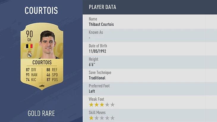 Главный соперник Облака в составах, состоящих из игроков испанского первенства. Карточка Куртуа по сравнению с FIFA 18 изменилась не сильно, разве что ногами бельгиец стал играть намного эффективнее.