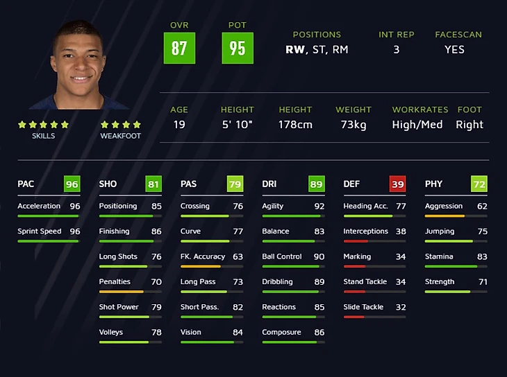 Рейтинг — 86 (95)Новоиспечённый чемпион мира, чемпион Франции, один из самых техничных, быстрых и забивных игроков мира. И это всё в 19 лет. Если Мбаппе, тьфу-тьфу, избежит в карьере травм, то у него есть все шансы, чтобы стать главной звездой футбола на следующие 10 лет.