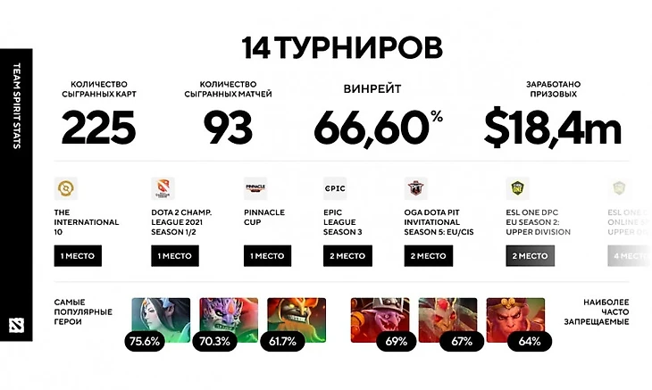 Team Spirit опубликовала статистику состава по Dota 2. Команда провела 93 матча с винрейтом в 66,6%. В поединках были сыграны 225 карт. Чаще всего чемпионы выбирали Mirana, Lion, Mars и банили Timbersaw, Medusa, Monkey King.