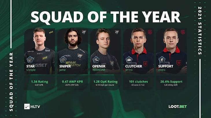 Александр S1mple Костылёв из Natus Vincere признан звёздным игроком сборной. Благодаря самому высокому AWP KPR лучшим снайпером назначен Джами Jame Али из Virtus.pro, а его тиммейт Марэк YEKINDAR Галинскис стал самым успешным энтри-фрагером в 2021 года. Ещё два представителя Gambit, Дмитрий sh1ro Соколов и Тимофей interz Якушин, заняли позиции клатчера и саппорта соответственно.