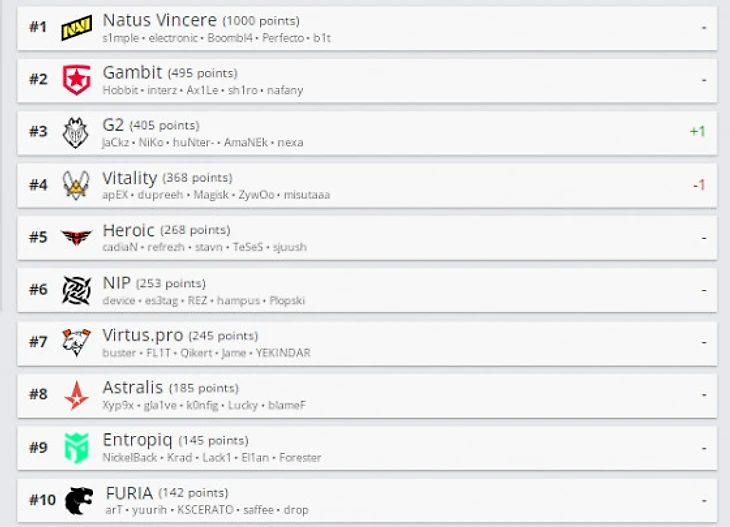 Портал Hltv опубликовал новый вариант рейтинга среди команд по CS:GO. На первом месте по-прежнему Natus Vincere с 1000 очков. Российская Gambit Esports сохраняет за собой вторую позицию.