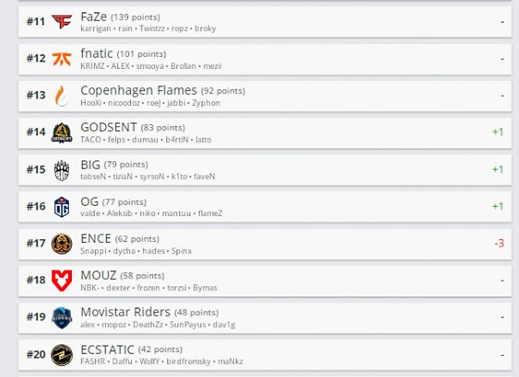 Из других изменений немецкий состав BIG закрыл топ-15, OG остановилась в шаге от этой позиции и занимает 16 место. ENCE уступила три строчки и расположилась на 17-й.