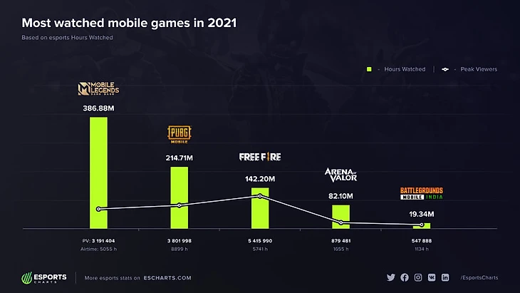 Бесспорным лидером пятёрки лучших стала Mobile Legends: Bang Bang. На просмотр соревнований зрители потратили 386,8 млн часов. Это в 2,5 раза больше уровня 2020 года. Самым популярным турниром оказался M3 World Championship с пиком в 3,1 млн зрителей.