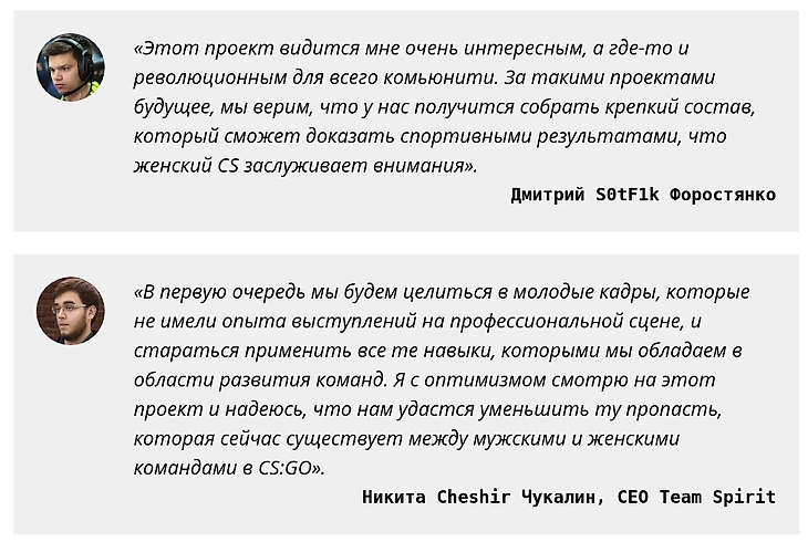Цель запуска женского состава — дать девушкам шанс проявить себя при тех же возможностях, что есть у мужских составов.