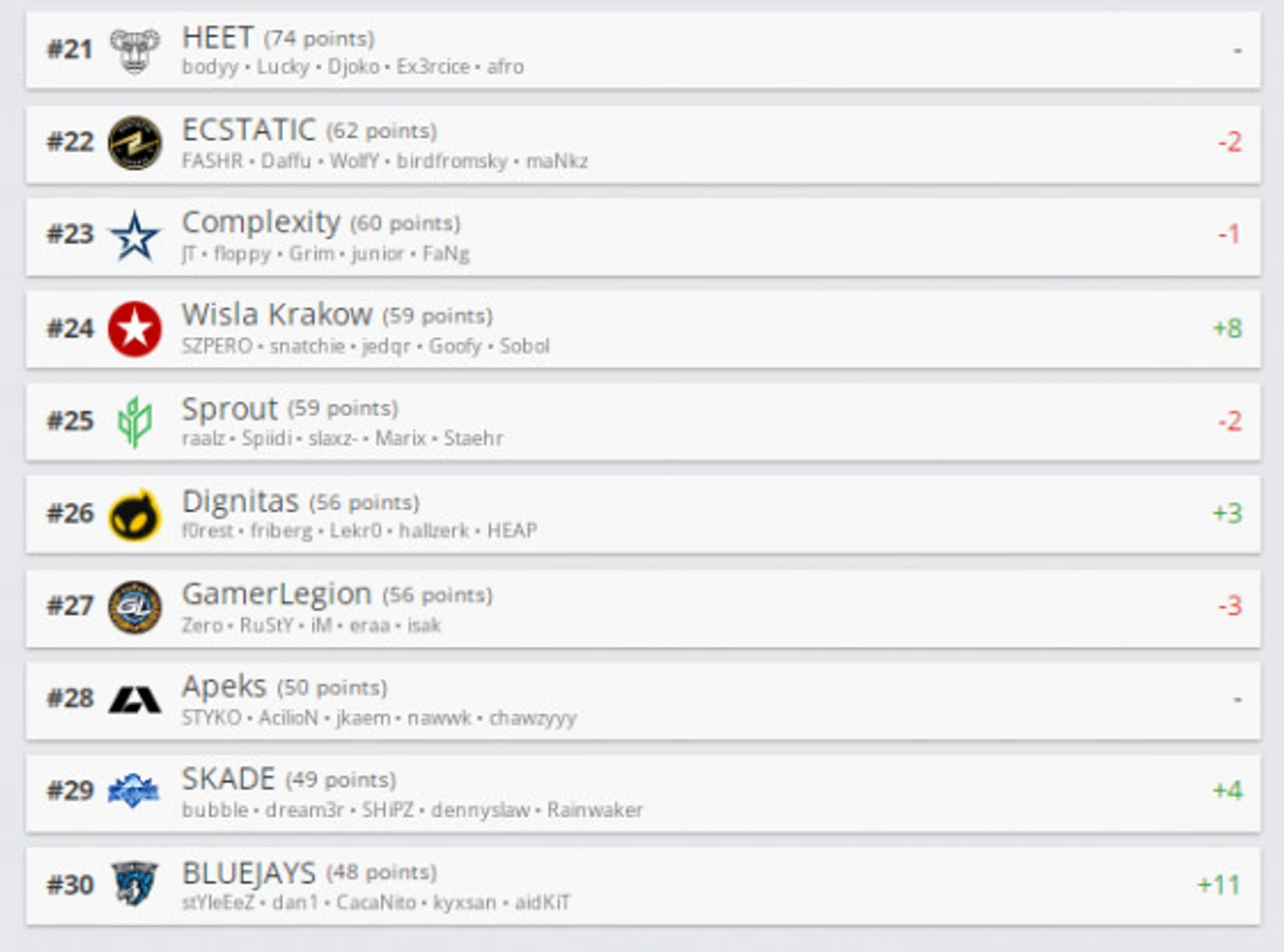 Из значимых изменений отметим несколько пунктов. MOUZ поднялась на шесть строчек. Wisla Krakow стала 24-й, улучшив положение на восемь позиций. В топ-30 ворвалась македонская BLUEJAYS, которой никогда в истории ещё не удавалось перешагнуть рубеж тридцатки.