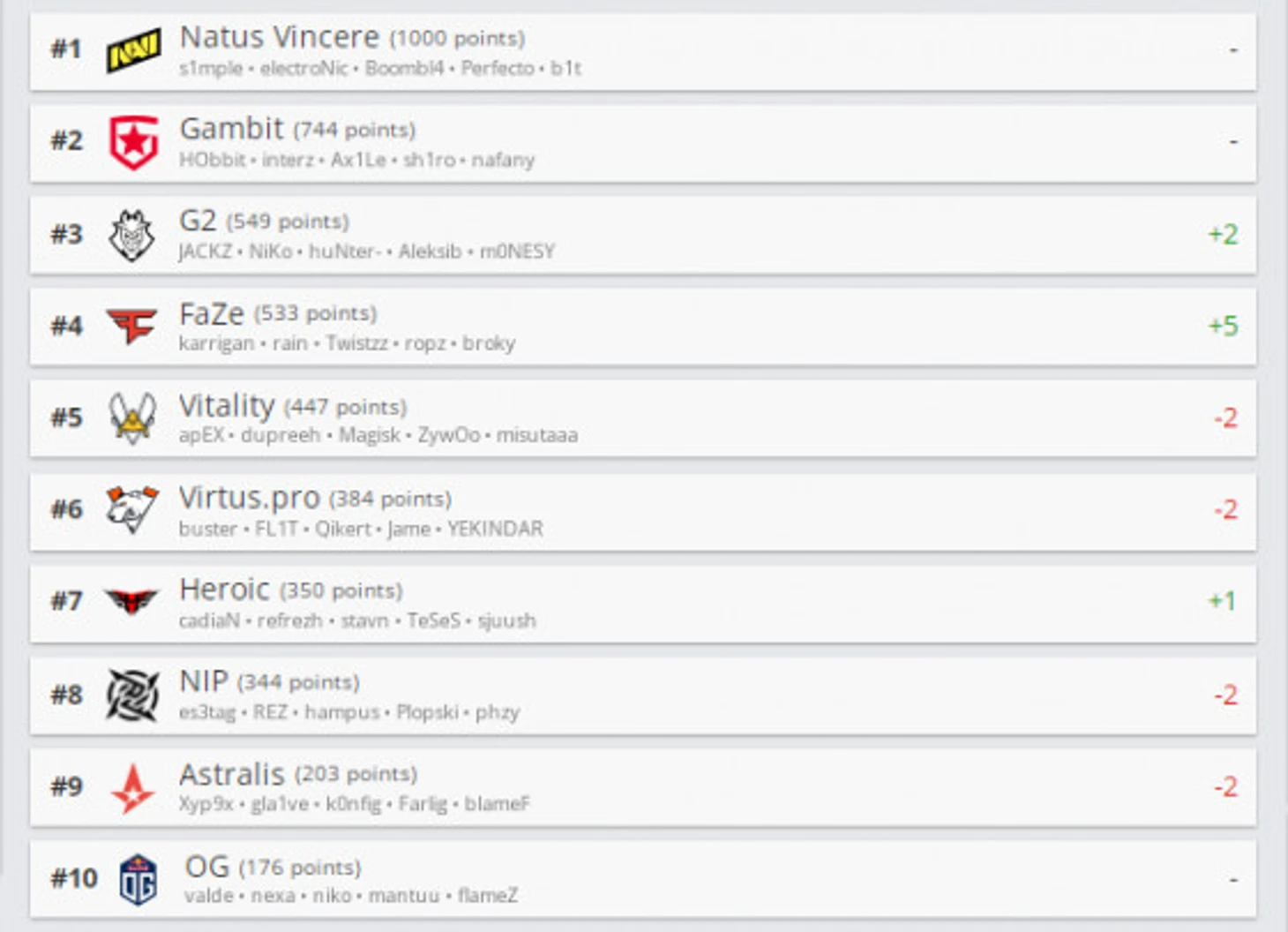 А вот G2 и FaZe поднялись на 3 и 4 места соответственно. Причём, FaZe сделала скачок сразу на пять позиций после победы на IEM Season XVI: Katowice. Отметим, что обе команды встречались в финале турнира.