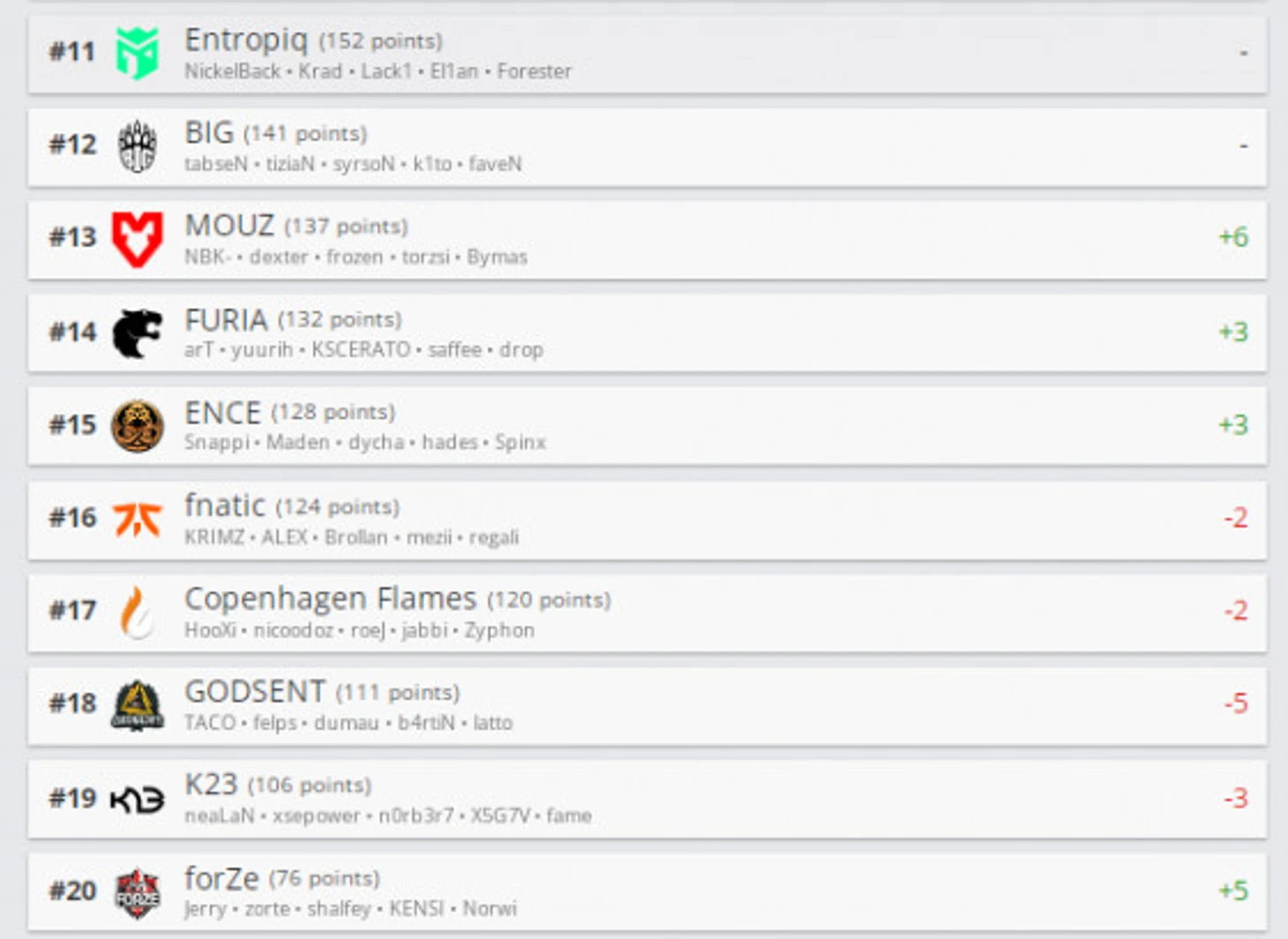 NiP и Astralis также опустились на две строчки относительно рейтинга предыдущей недели. Entropiq сохранила 11 место. На три строчки ухудшила позицию K23 — теперь она на 19 месте. А вот forZe поднялась сразу на пять позиций и замкнула топ-20.