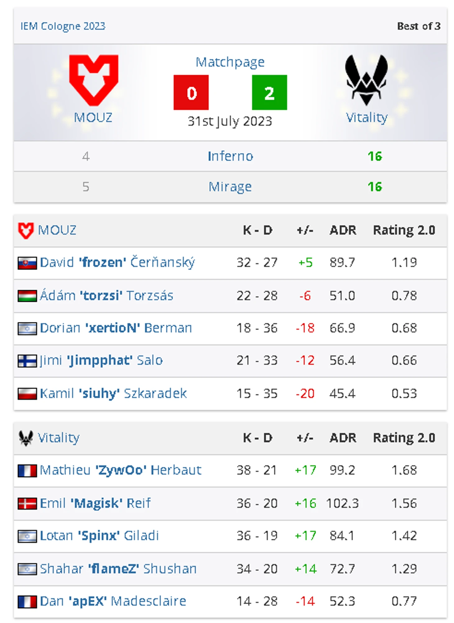 Великолепная форма команды Vitality оказалась слишком сильной для MOUZ, которые сумели выиграть всего девять раундов на двух картах в их противостоянии на IEM Cologne.