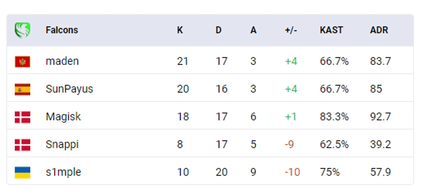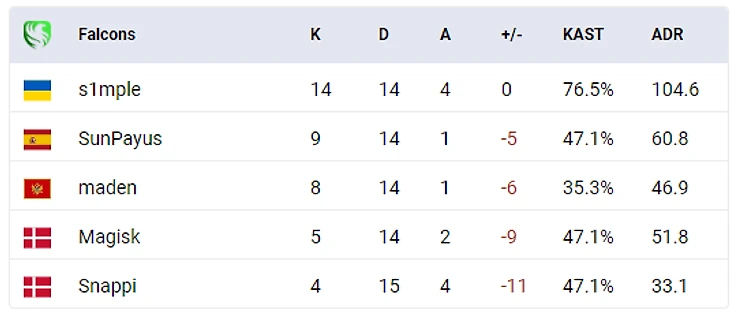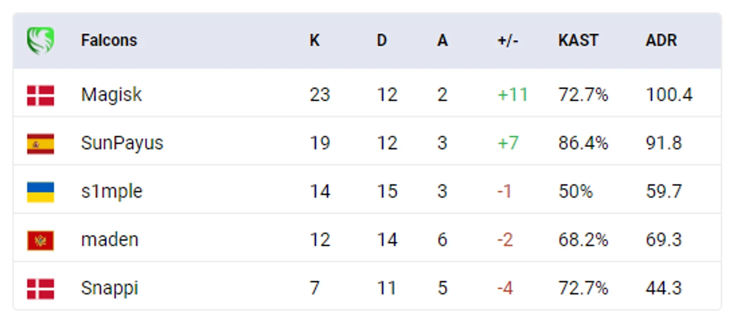 Самое интересное начинается с дебютного матча Falcons. Первой картой был Mirage, где s1mple по ожиданиям должен был занимать лидирующую строчку по статистике, но по итогу карты, он занял всего лишь 3-е место из 5, чем очень сильно огорчил и команду и основателей CEO, они даже не рассчитывали на такой результат. Всю игру взял на себя Magisk, заняв 1 место по статистике, далеко оторвавшись от свои тиммейтов по команде, благодаря чему Falcons и выиграли первую карту со счетом 13 - 9, но это не все, ведь на очереди еще две.