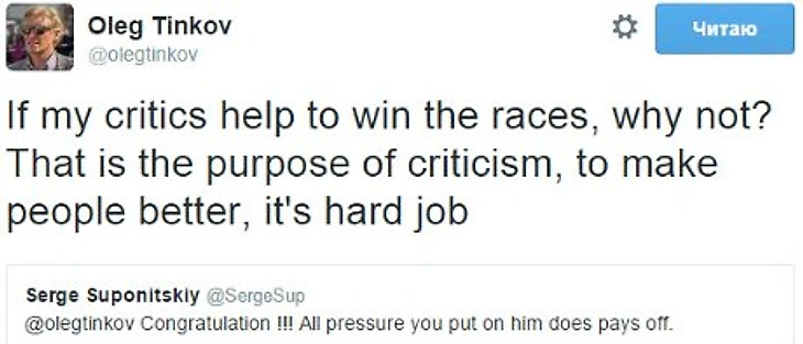 «Если моя критика помогает выигрывать гонки, то почему бы и нет? Это цель критики – сделать людей лучше, тяжелая работа», – написал Тиньков.