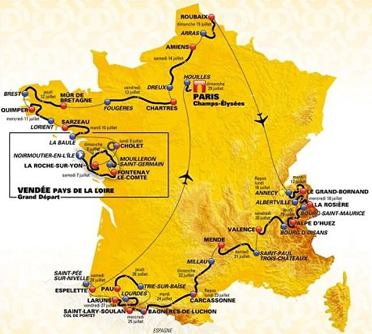 Гонка возьмет начало в городе Нуармутье-ан-л’Иль на западе Франции, финиш по традиции состоится на Елисейских полях в Париже.
