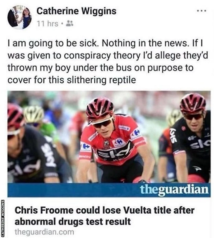 Жена Уиггинса о допинговом деле Фрума: «Могла бы подумать, что моего мужа бросили под поезд ради прикрытия этой ползучей рептилии»