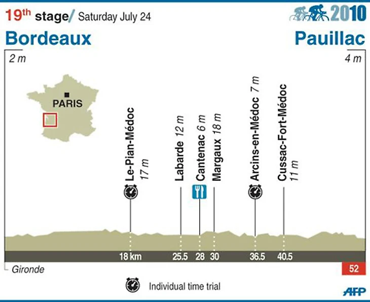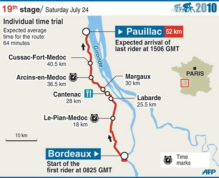 Фабиан Канчеллара выиграл оба старта на время на «Туре»-2010. Вслед за прологом в Роттердаме швейцарцу не было равных в «разделке» в Бордо. Немец Тони Мартин был единственным, кто оказался способен пройти 52 километра вдоль устья Гаронны в его темпе, но чуть-чуть уступил на финише.