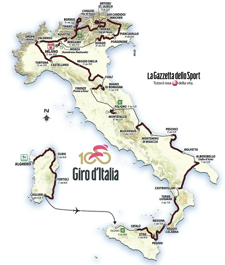 Во-первых, трансферы между этапами будут относительно короткими, по словам директора гонки Мауро Веньи, они равны третьей части переездов на "Тур де Франс". Гонщиков ждет перелет из Сардинии на Сицилию, а затем короткая переправа на материк.