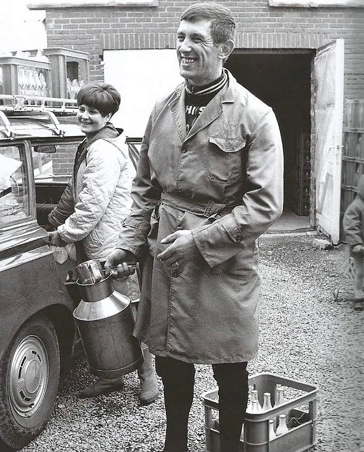 Дело в том что параллельно со спортом, приносившим в начале карьеры небольшие деньги, он вместе с женой развозил по округе молоко, вставая очень рано – обычно в 5.30 утра. Нашел таки фото Франса «Летучего молочника» Бербека в обеих его ипостасях – с бидоном и в гонке. Причем начинал он тренировки сразу после развозки молока.