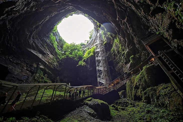 Открытие пещер состоялось всего 130 лет назад, когда спелеолог Эдуард-Альфред Мартель обнаружил подземную реку. Притом проект мог и не состояться, поскольку у исследователя был план, но не хватало денег на его реализацию. Как это часто и бывает, помог случай. Когда Мартель был в Париже, во время одной из поездок он забыл в экипаже сумку со всеми планами и картами. Следующим пассажиром оказался наследник ирландской семьи пивоваров Джордж Бимиш, который внимательно изучил содержание сумки и был впечатлен грандиозностью проекта. Он связался с Мартелем и предложил составить ему компанию, при этом став ключевым спонсором ведения работ.