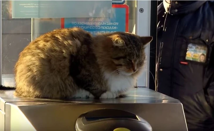 В павильоне с турникетами на железнодорожной станции Заветы Ильича в подмосковном городе Пушкино появился кот, который целые дни проводит со сотрудниками Центральной пригородной пассажирской компании, контролируя пассажиропоток.